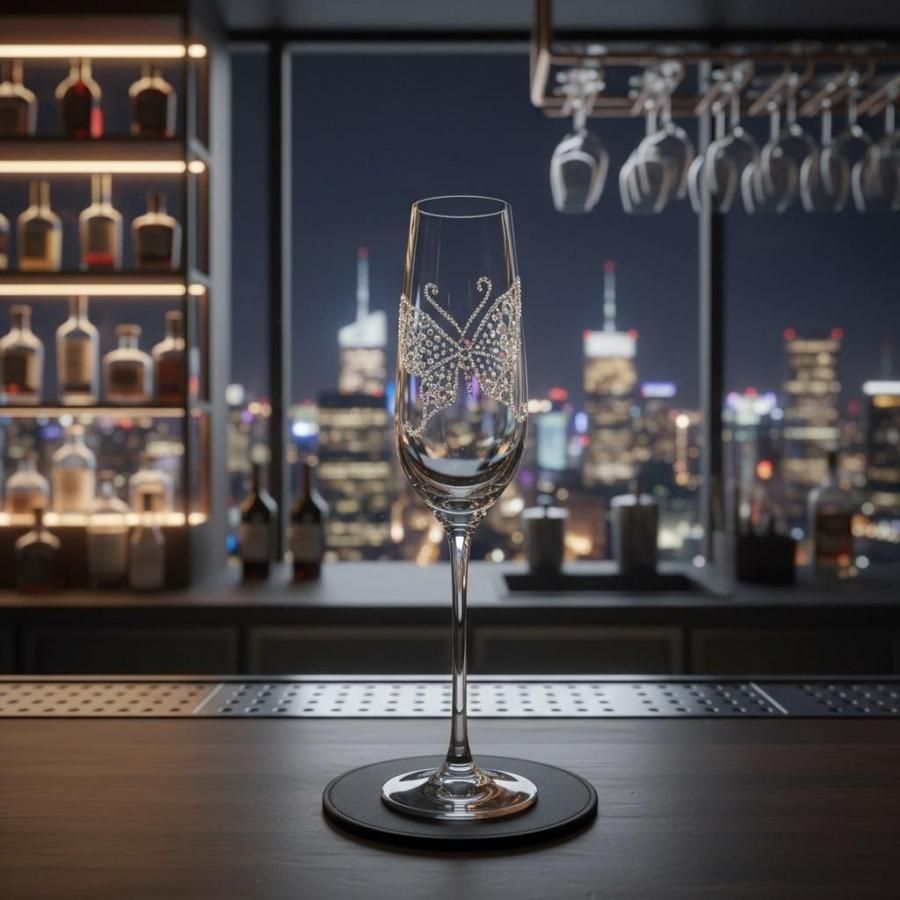 【シャンパングラス バタフライ】は、シンプルなグラスに舞い降りる蝶をモチーフに、スワロフスキー社製のクリスタルで上品にデコレーションされた一品。 さりげなくも華やかな輝きが、グラスの中の泡と共に美しい瞬間を演出します。 色はお好みのスワロフスキーカラーをお選びいただけるため、特別な贈り物としてもおすすめです。
